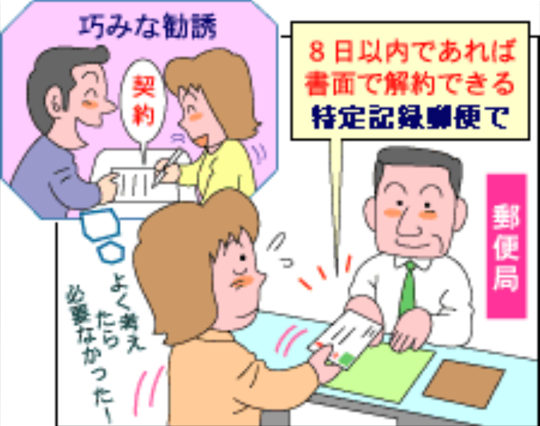 法規制 2015年8月31日 by ijima クーリングオフ制度 訪問販売や店舗以外の場所での契約の場合、契約の対象・方法により違いますが、8日間となっています。これは、アポイントメント・セールスやキャッチ・セールスでは、たとえ店舗契約しても、商品売買の目的と無関係の口実で勧誘された場合、同様の規制を受けることができます。