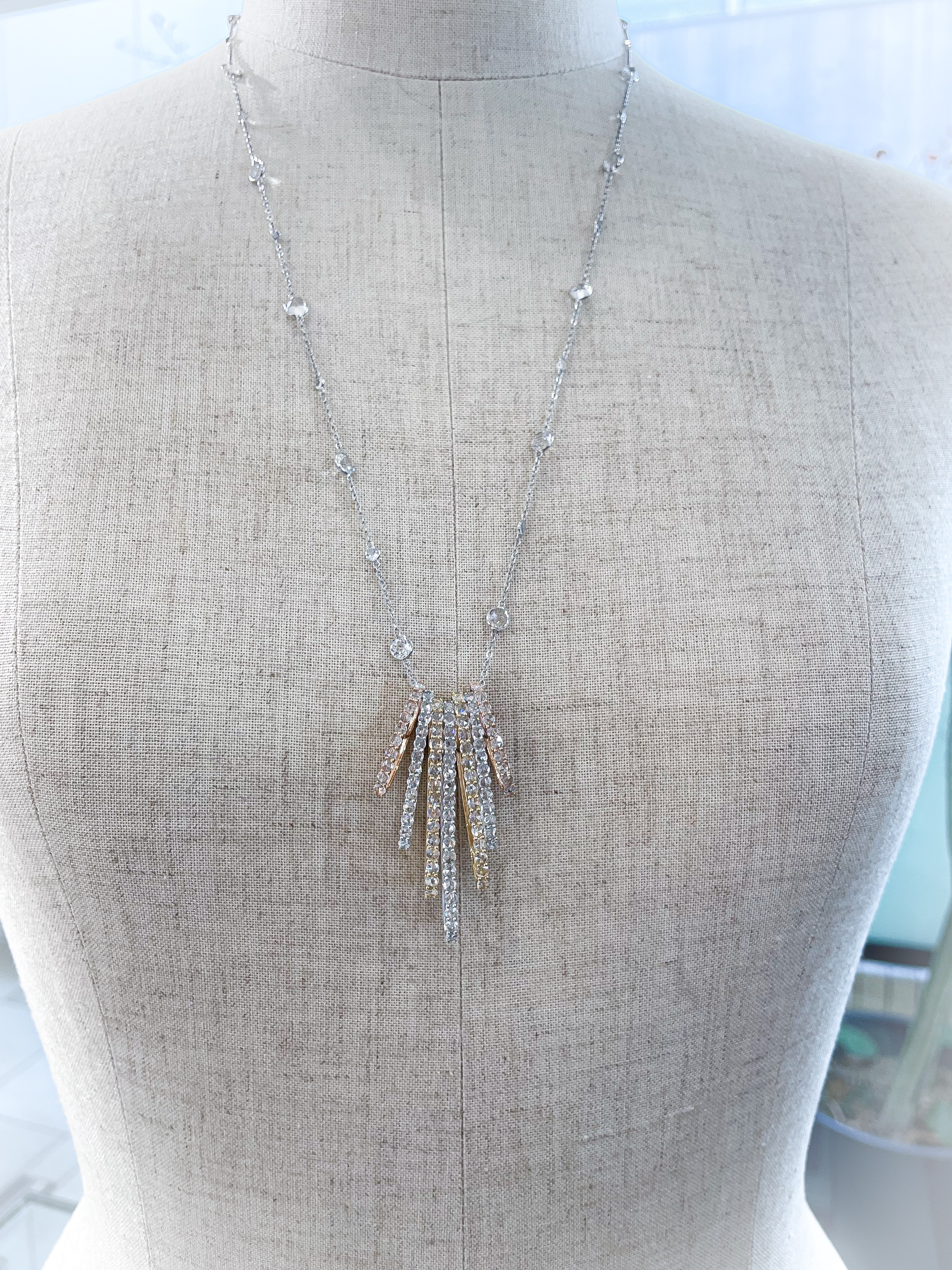 ローズカットダイヤモンドペンダント 2022年1月25日 by ijima K18WG ローズカットダイヤモンドペンダント ペンダント部分のダイヤモンドはローズカットを使用しております。 合計 3.35ct 使用しております。ローズカットの気品の高さと作品の繊細の作りが合わさり、エレガントなジュエリーになりました。 ネックレス部分には、覆輪止めで、ホワイトサファイヤをステーション間隔に配置していて、ロングネックレスだけでも、ご使用いただけるレベルです。 税込88万円で現品限りのご奉仕。