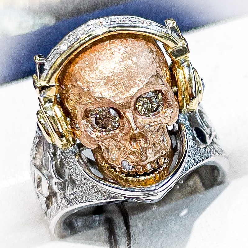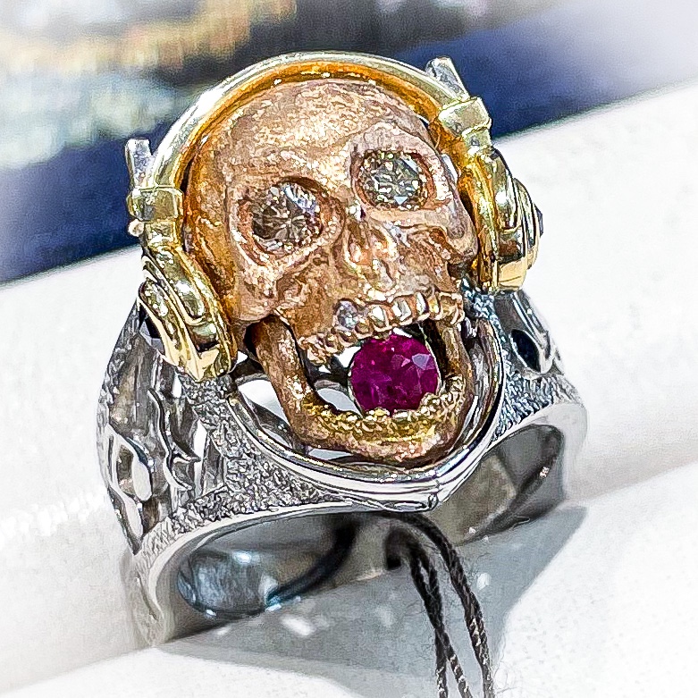 梶光夫ジュエリースカルリング 2022年2月9日 by ijima 梶光夫ジュエリー スカルリング 梶光夫ジュエリー スカルリング 梶光夫ジュエリー スカルリング 梶光夫ジュエリー 新作スカルリング 頭の部分はK18。目には大粒のダイヤモンド。歯にもダイヤモンドのアクセント。ダイヤモンドの付いたヘッドフォン。 口は開閉するようになっていて、口を開けるとルビーが見える。これは心臓をイメージしている様です。