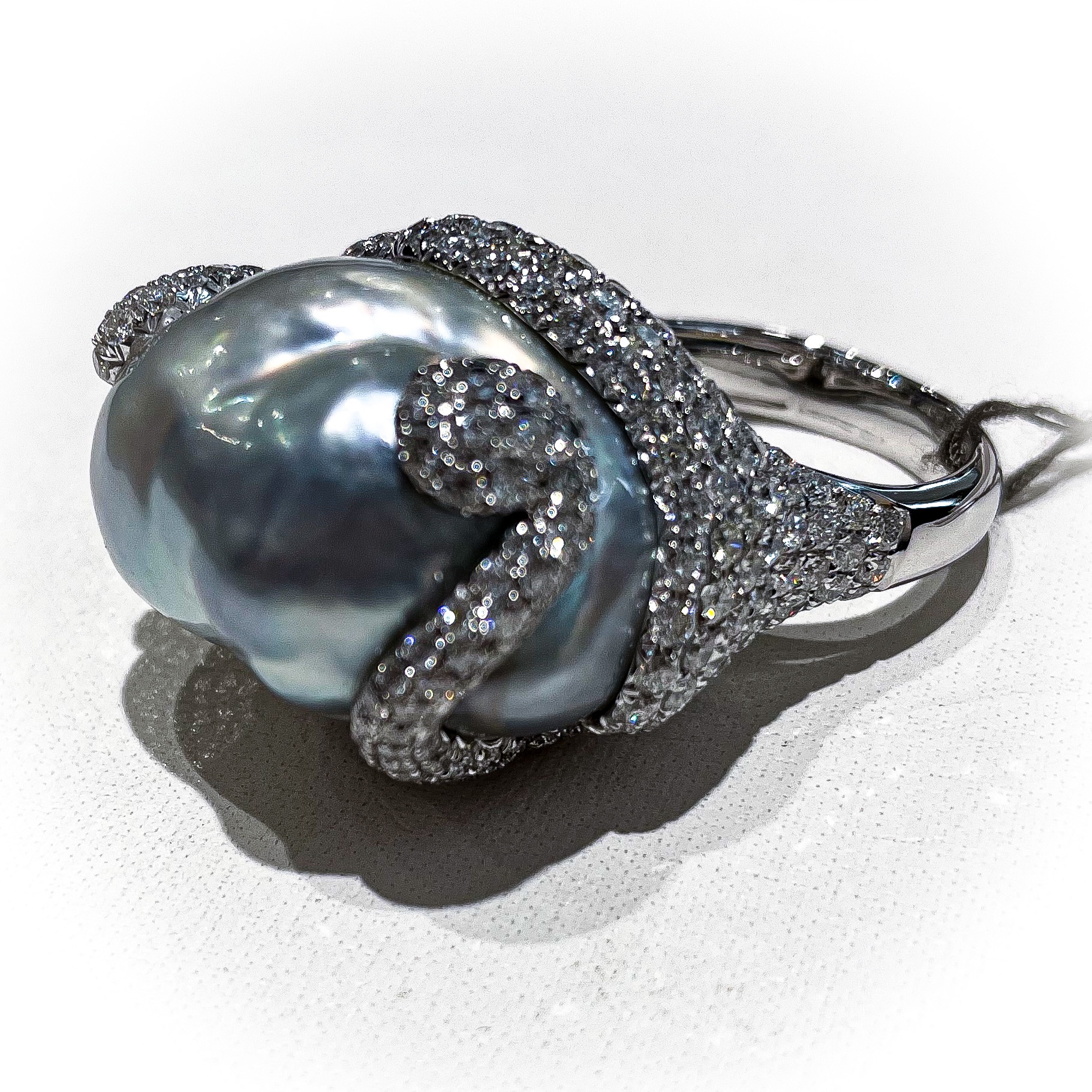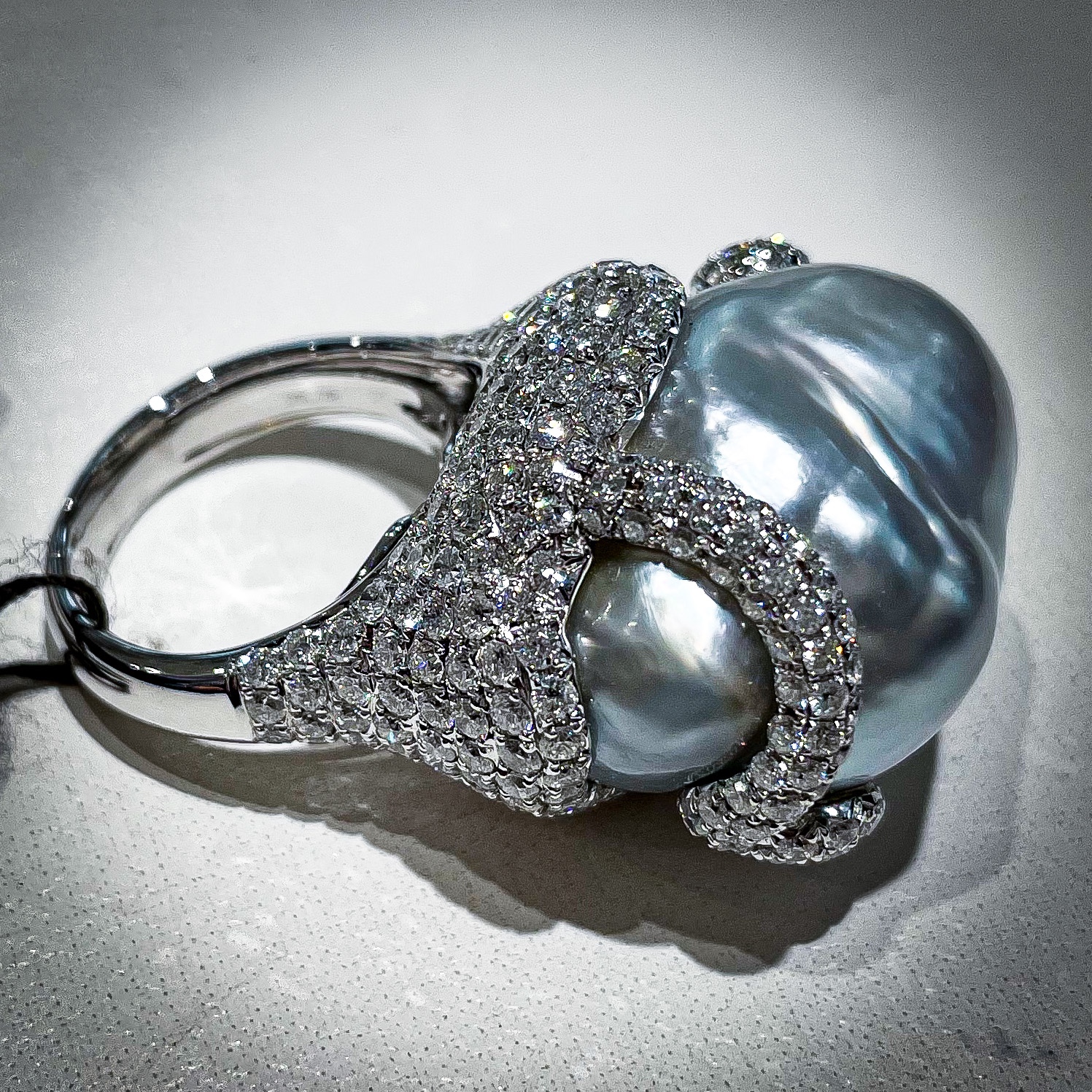 梶光夫ジュエリー 南洋真珠 2022年2月10日 by ijima 梶光夫ジュエリー 南洋真珠リング 梶光夫ジュエリー 南洋真珠リング 梶光夫ジュエリー 南洋真珠リング 梶光夫ジュエリー 南洋バロック真珠リング 類に見ない大きさのバロック真珠をリングに加工する発想が面白い。 ダイヤモンドで覆い被せたデザインで高級感を演出。 高さと重さで回転するのを防ぐため、リングの裏側に板バネを配置し、しっかりと指にフィットする仕掛けになっています。