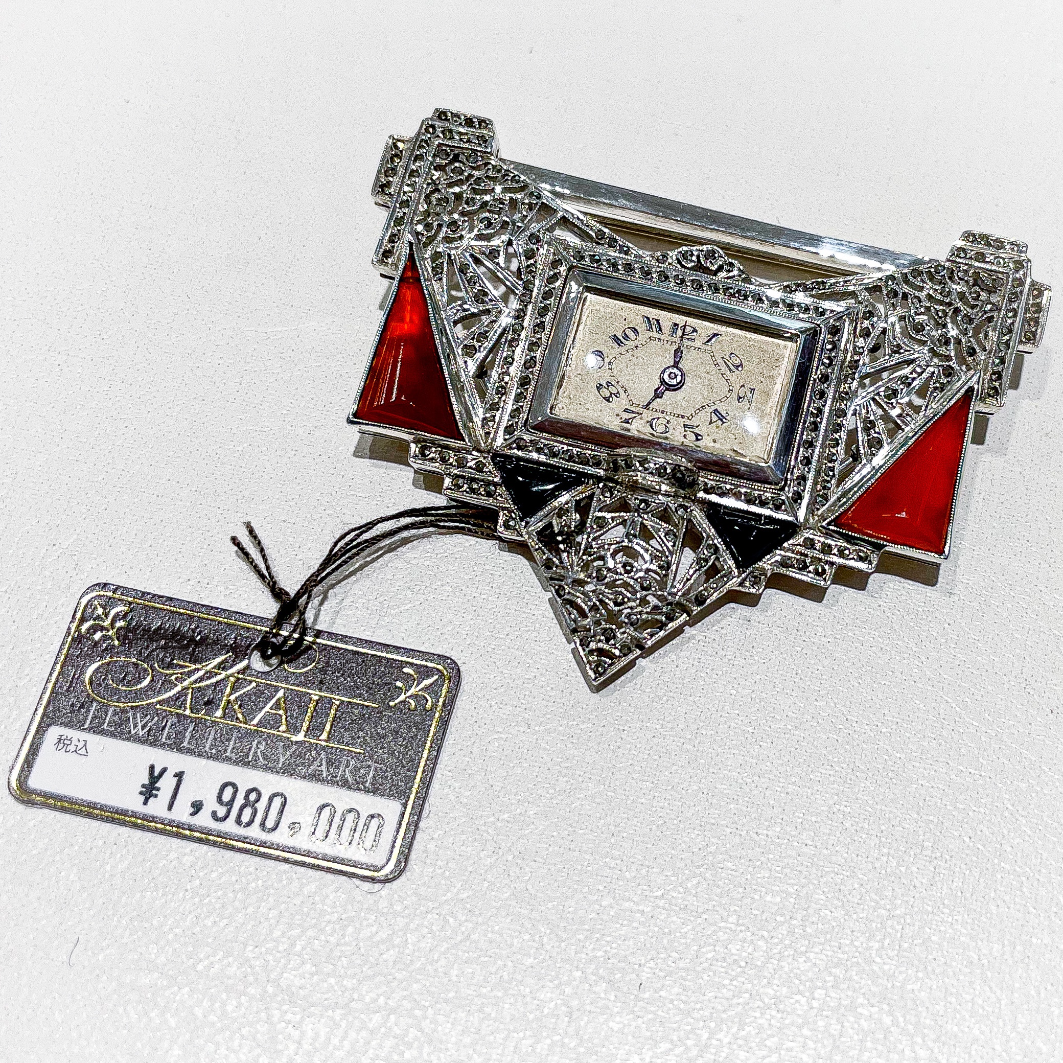 梶光夫ジュエリー アンティークウォッチブローチ 2022年2月13日 by ijima 梶光夫 アンティークウォッチブローチ 梶光夫先生の召集品で、1900年頃の時計付きブローチです。 時計は機械式で今でも時を刻みます。 ブローチとして製作されていますが、時計の周りが展開できるようになっていて、卓上の置き時計としても組み替えることのできる作品です。 男性が装着していたと思われますが、直線的なクアドラートなデザインは、紳士的な重厚感がありますね。