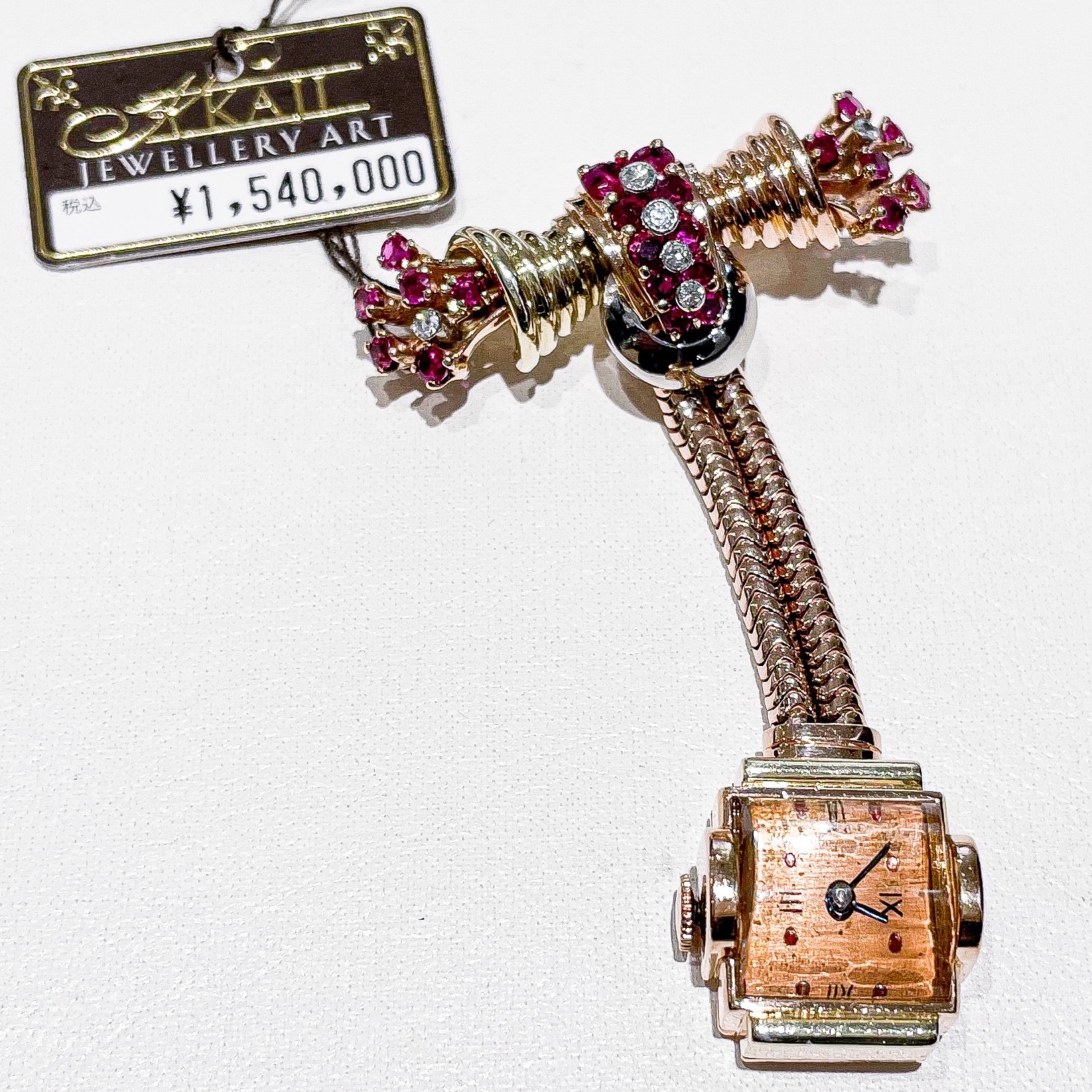 梶光夫ジュエリー アンティークウォッチブローチ2 2022年2月14日 by ijima 梶光夫ジュエリー アンテイーク時計ブローチ 梶光夫ジュエリー 蒐集品 アンティークウォッチブローチ K18にルビーやダイヤモンドをふんだんに使用して、作られた時計ブローチ。 もちろん機械式時計もしっかりと今も時を刻みます。 ルビーの石どめ、チェーン部分のスネーク加工、時計文字盤のルビーなど、近年の加工でも難しい一流の技術が使われています。 時計は裏返しに文字盤を配置されています。ブローチをしたまま、時計だけを持ち上げて観る様にしてあります。