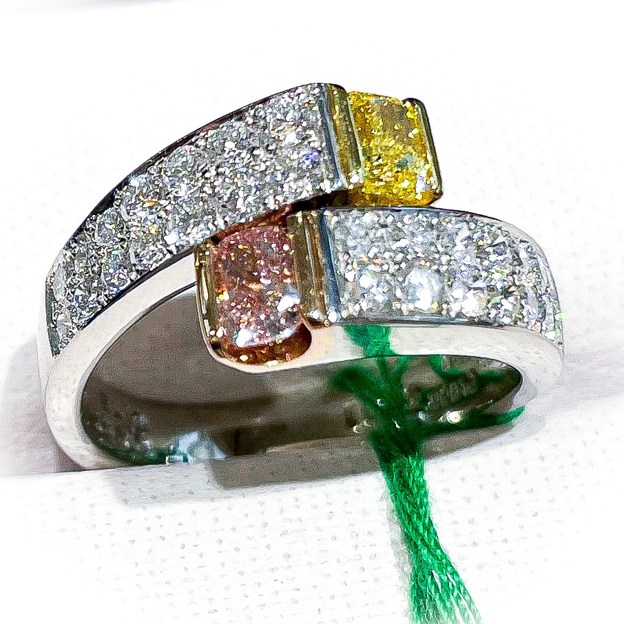 ピンク・イエローダイヤリング 2022年3月15日 by ijima ヴィヴィッドイエロー・ファンシーピンク Pt900/K18 0.301ct ファンシーピンク VS1 0.327ct ファンシーヴィヴィッドイエロー 脇石 0.92ct