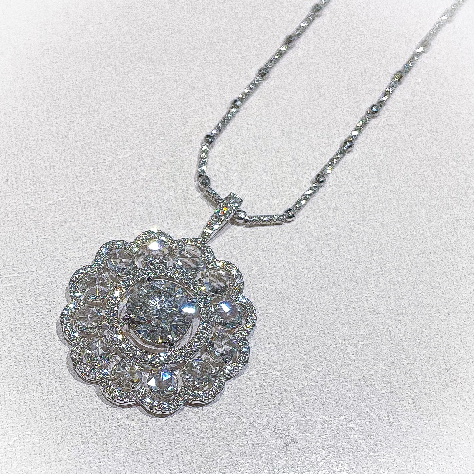 大粒ダイヤモンドペンダント 2022年3月19日 by ijima 3.02ct H VS1 VG/2.89ct/1.35ct 中石 3.02ct H VS1 Verygood を使用。 脇石は、ローズカット(オールドカット)のダイヤモンドを2.89ct 配置して取巻き さらにメレダイヤを1.35ct 使用して輪郭を整えてあります。 まさに細かい細工まで完璧に仕上げた最高級のジュエリーです。
