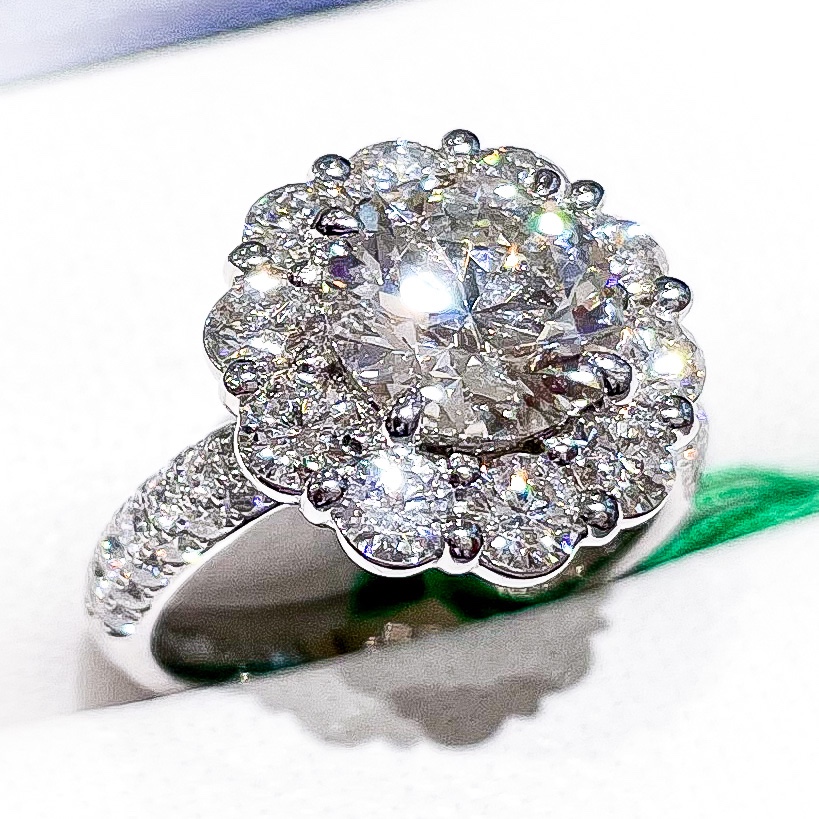 エクセレントブリリアント 2022年3月26日 by ijima Pt diamond 2.15ct SI2 I excellent 中石 2.15ct SI2 I excellent 脇石ダイヤモンド合計 1.73ct プラチナ製作 中石のエクセレントカットの輝きが眩しい。
