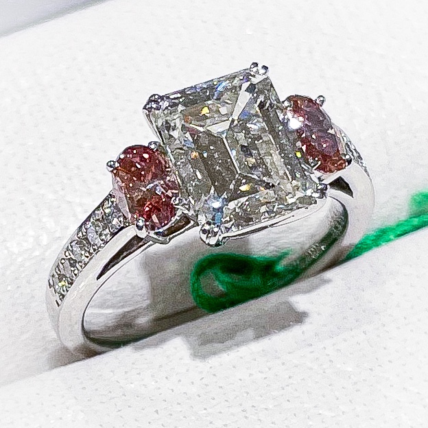 エメ角 ピンク添え 2022年3月28日 by ijima 2.388ct H VVS2 EMcut with pink 中石 2.388ct H VVS2 エメラルドカット 脇石 ピンクダイヤモンド 0.269ct/0.227ct シンプルで落ち着くデザインであるが、サイドのファンシーピンクのダイヤモンドを脇役に使うという贅沢なデザイン。 プラチナ製作の逸品ジュエリー