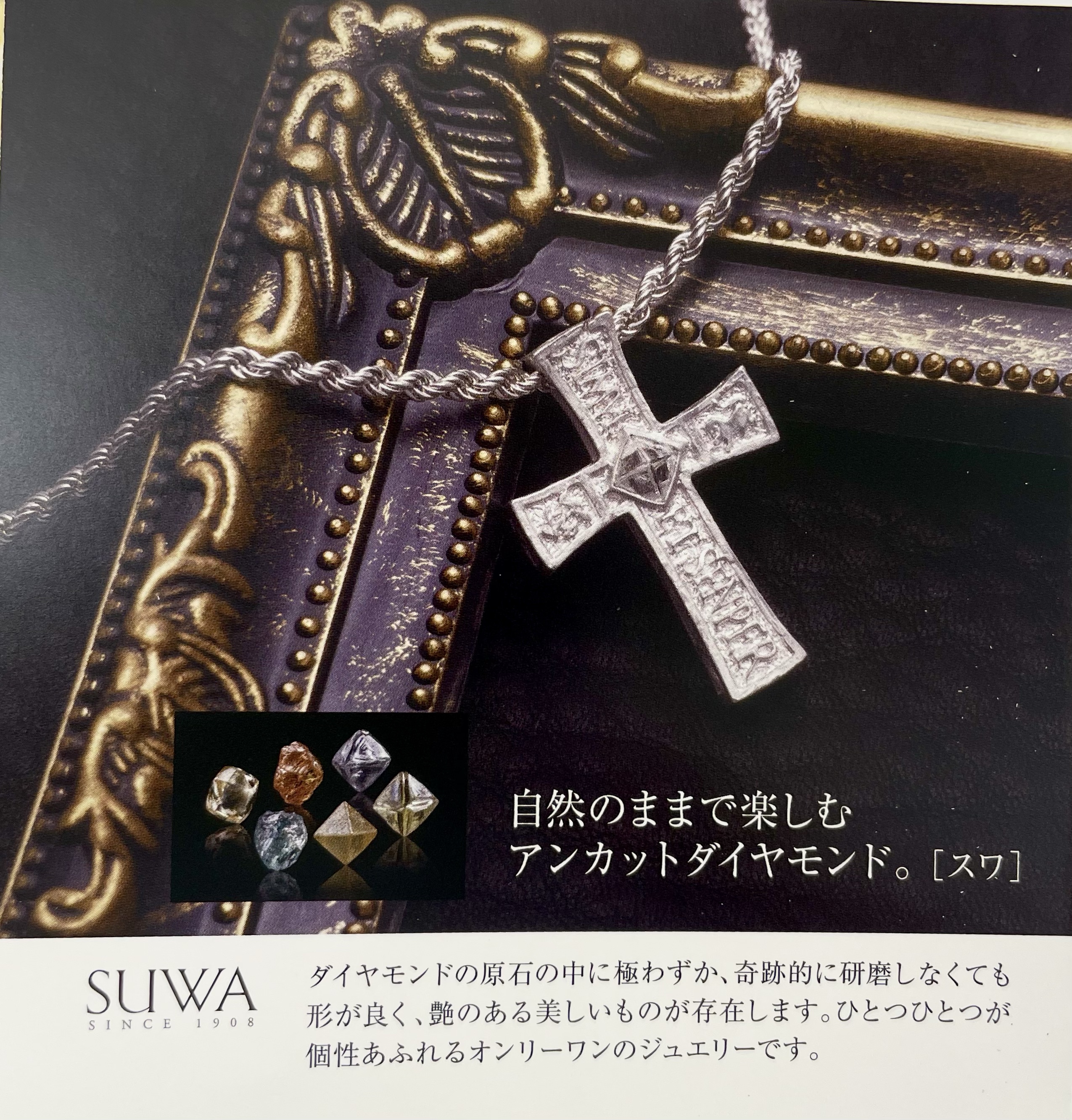 展示会出品 SUWA ジュエリー 2022年7月5日 by ijima SUWA アンカットダイヤモンド 24日(日) ジュエリーフェアに出品の中から、おすすめの「SUWA アンカットダイヤモンド」をご紹介いたします。 自然のままの原石のダイヤモンドの中から、奇跡的に研磨しなくても形が良く美しい品質のいいアンカットダイヤモンドをジュエリーにしました。