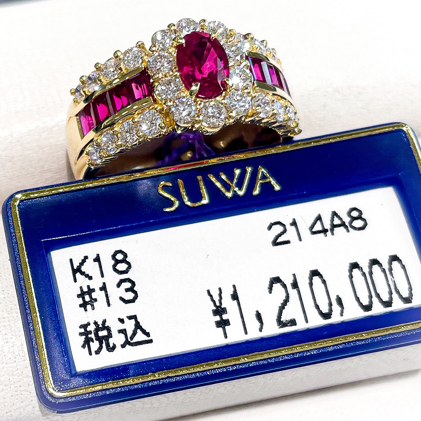 SUWA ルビーリング 2022年7月8日 by ijima ブログをご覧のお客様だけにお買い得商品のご紹介をいたします。 24日日曜日のジュエリーフェアに「SUWAジュエリーのお買い得ライン」のコーナーを設けます。 通常、お値引きは一切させていただけない「SUWAジュエリー」ですが、製品11点を30%OFFで、販売いたします。 シークレットセールとなりますので、あくまでブログをご覧になったお客様のみ。 K18/ R:1.30ct D:0.80ct ルビーダイヤモンドリング
