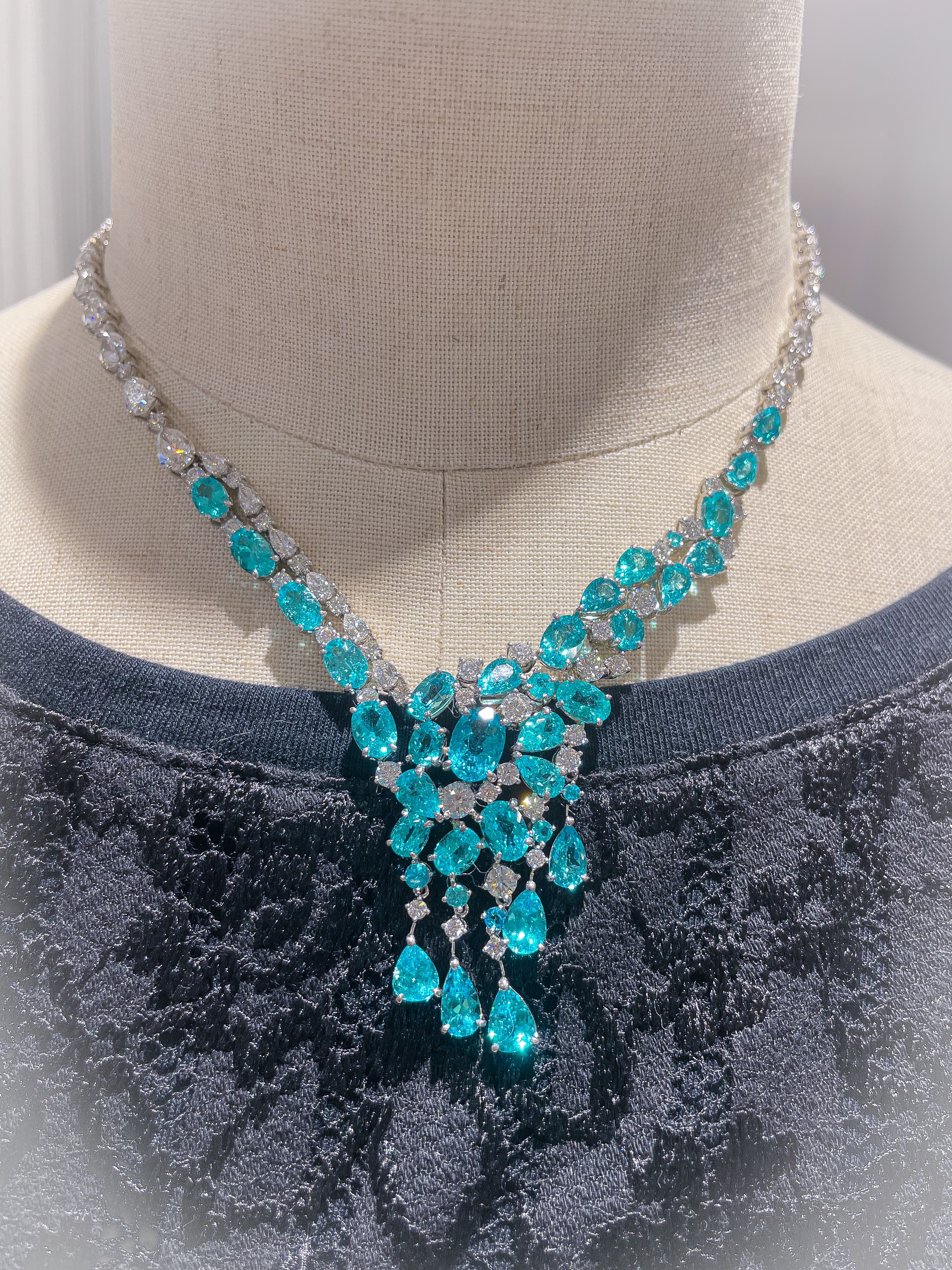 パライバネックレス 2022年8月10日 by ijima Pt900 ブラジル産パライバトルマリンフルネックレス パライバトルマリン 12.15ct メレダイヤ 4.385ct H-SI1up 価格は 3億8500万円