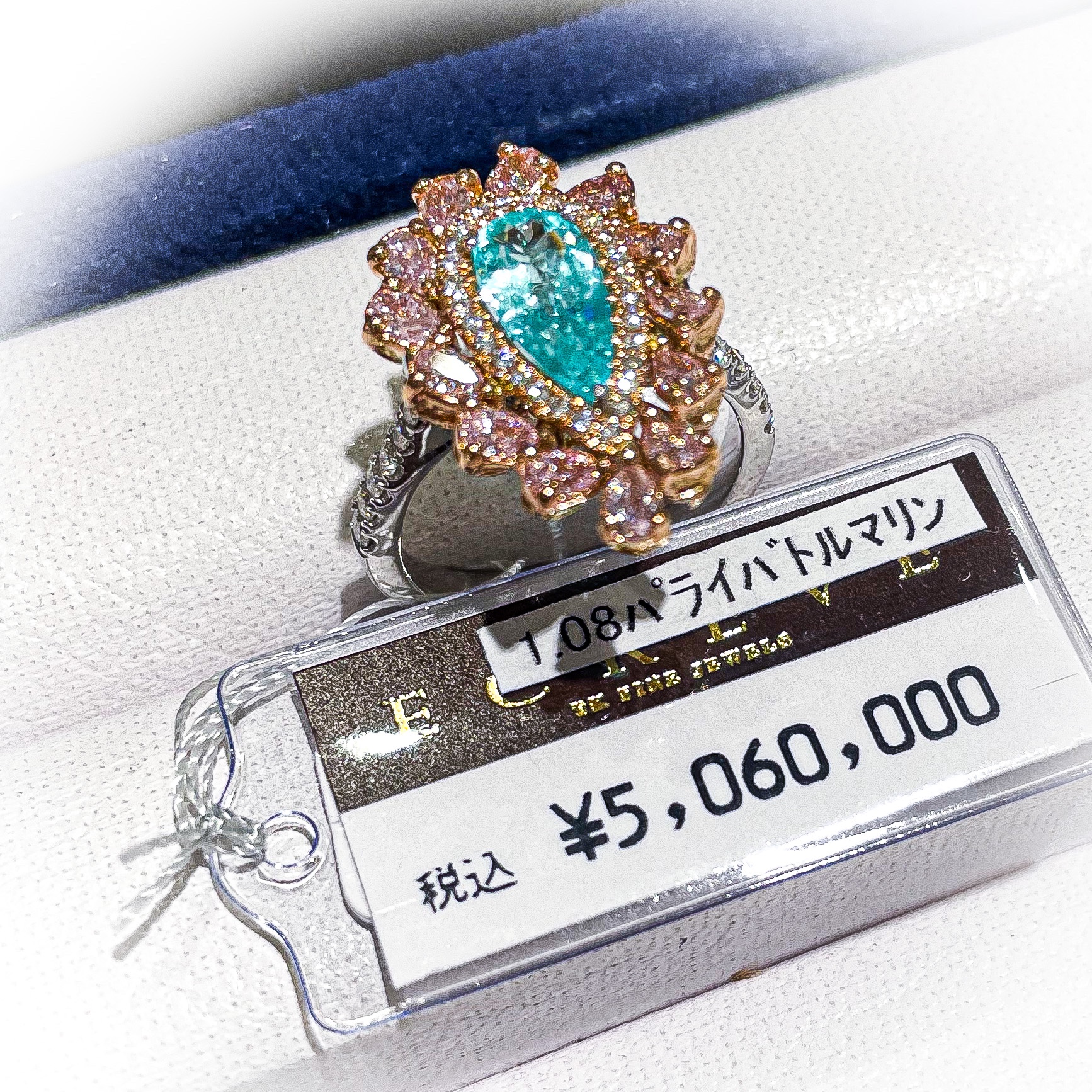 パライバ&ピンクダイヤリング 2022年8月22日 by ijima 人気のパライバトルマリンに、希少で価値が上がっているピンクダイヤモンドを贅沢に取巻きしています。 人気の価値ある希少石を独り占めした、うらやましい限りのデザインです。 中石のパライバはアフリカ産ですが、ペアシェープのカットが美しく色も濃く見えます。ブラジル産のパライバトルマリンに見間違えるほどです。