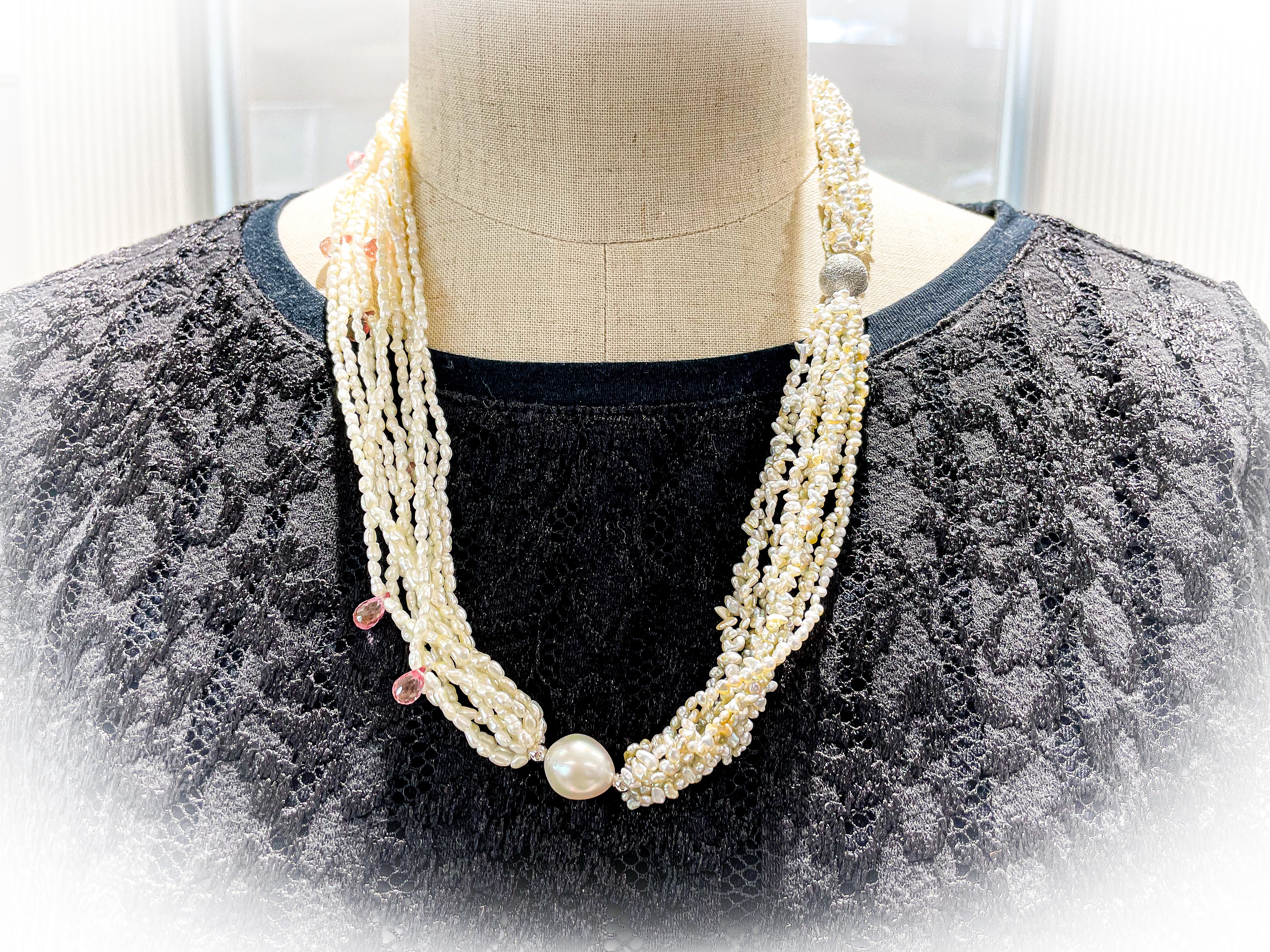 アコヤ貝 ケシパール5 2022年8月30日 by ijima アコヤ貝 ケシパールロングネックレス 不揃いの天然無核アコヤ貝ケシパールを自由に組み合わせています。 大きな白蝶真珠が存在感を出していてピンクサファイヤのブリオレットカットを飛び出すようにポイント使いされています。