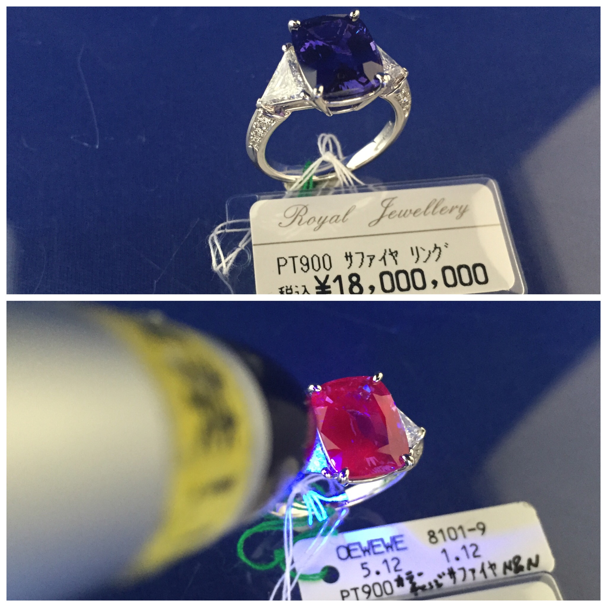 チェンジオブカラー 2015年9月22日 by ijima こちらの写真の写真は、同じサファイアです。 もちろん、天然無処理の逸品となります。 室内光では、サファイア本来の青い色合いですが、白熱灯の光では、ルビーのような赤い色合いに変化します。 カメレオンサファイアとも呼ばれますが、非加熱無処理の逸品は、珍しく、大粒の割にインクルージョンが少ないのも貴重です。