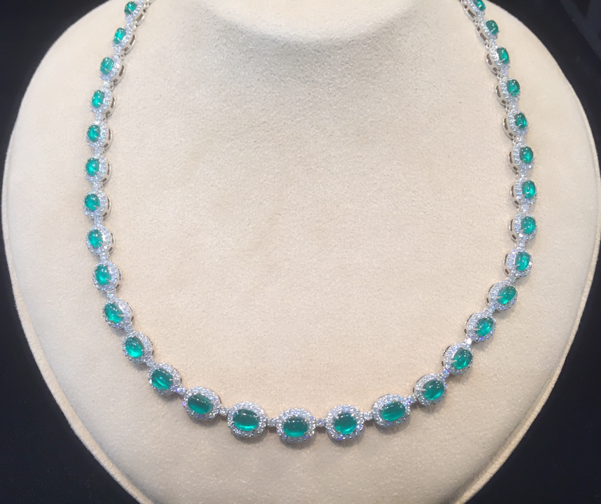 エメラルドキャッツアイ 2015年10月4日 by ijima エメラルドキャッツアイの全周ネックレスです。猫の目のような模様が出る光学効果をキャッツアイと呼びます。ダイヤモンド以外の宝石には可能性がある効果で、インクルージョンに平行して底面をカボションカットすると表れます。エメラルドのキャッツアイは、綺麗な色味が少ないので、このような猫目が規則正しく並んだ美しい全周ネックレスは、非常に希少な逸品作品です。
