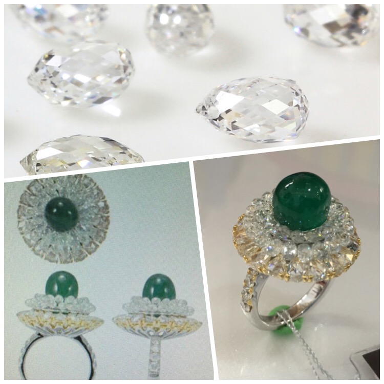 ブリオレット作品 2015年9月19日 by ijima エメラルドの作品が続いたので、もう一点、最新作品を紹介します。シャンデリアのように裏表全面に立体的にカットされた『ブリオレットカット』のダイヤモンドをエメラルドリングの装飾に使用しました。 設計図通りに仕上がり、素晴らしい作品になりました。 エメラルドの周りにブリオレットカットのダイヤモンドを爪や台座を使わずに石留めしています。 エメラルドも球型のカボションカットで、素敵な石です。