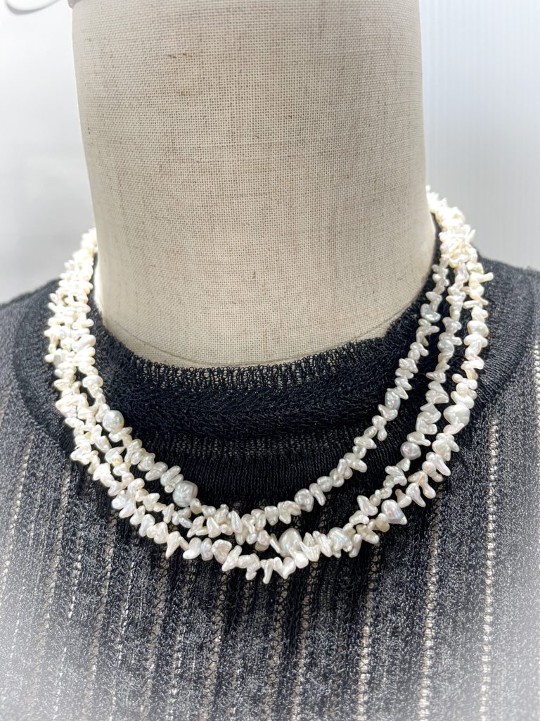 無核ケシ ネックレス 2022年11月8日 by ijima アコヤ貝から自然に採取された無核の真珠です。形は不揃いですが自然の感じがして無核らしいので人気商品です。 Bone(骨)のような形をしているため、ボーンケシと言われていますが、このタイプは真珠層(巻き)が厚いため、透明感と照りがありアクセサリーには適しています。 写真の品は、43cm 3連 税込18万円でご提供いたします。