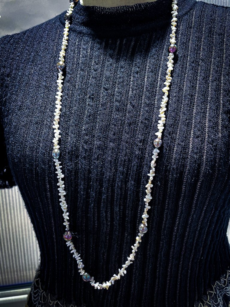 ナッツケシ珠 マルチネックレス 2022年11月13日 by ijima ナッツ形の天然無核真珠だけを集めた拘りを感じるネックレスです。 色艶もいい無核真珠は、収穫量の1/100程度しかない希少な珠です。 形も色や大きさを揃えて製作するには、大量の珠在庫を必要とするため、近年は作品を観ることもなくなりました。 黒蝶真珠を混ぜてロングネックレスに製作いたしました。 税込138,000円で、ご提供いたします。