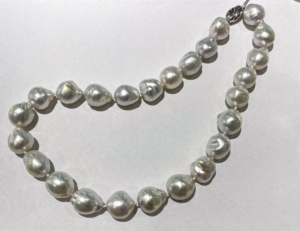 南洋バロック真珠ネックレス 2022年11月17日 by ijima 南洋バロック真珠ネックレス 25珠 48cm の南洋白蝶真珠のバロック型ネックレス。 15mm〜16.5mm 巻き厚で艶感があり、いかにも高級なイメージが溢れている。 写真ではわかりにくいが、ピンク色が差す美しい色合いです。 今でも、300万円はくだらない評価がある真珠ネックレスです。 世界的に人気があり、日本国内には流通量が少なく、あまり店頭で見かけることも無い希少な真珠です。 ブログを観た方のみの特別価格 800,000円税込で販売いたします。 もちろん現品限りなので、早い物勝ちです。