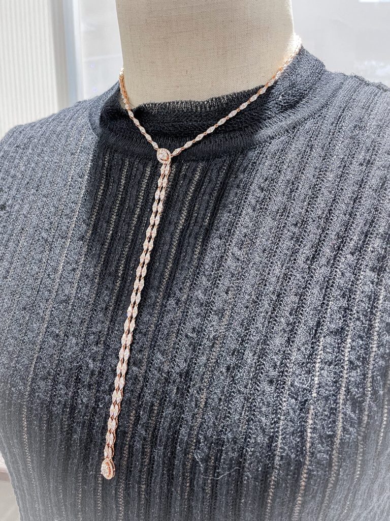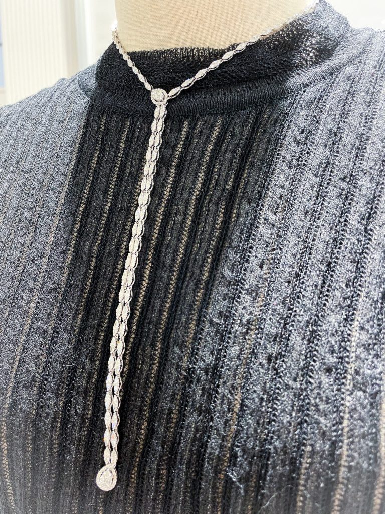 エクレブ クリスマス新作Ⅺ 2022年12月15日 by ijima Y型のネックレスは、もっとゆったりとした襟ぐりのデザインが主流でした。 チョーカー使いのフルネックレスに、アンバランスに垂れ下げたフルダイヤのタイ。 今回は、WG と YG の二種類を紹介いたします。 6、74ct使用しており、価格は税込440万円