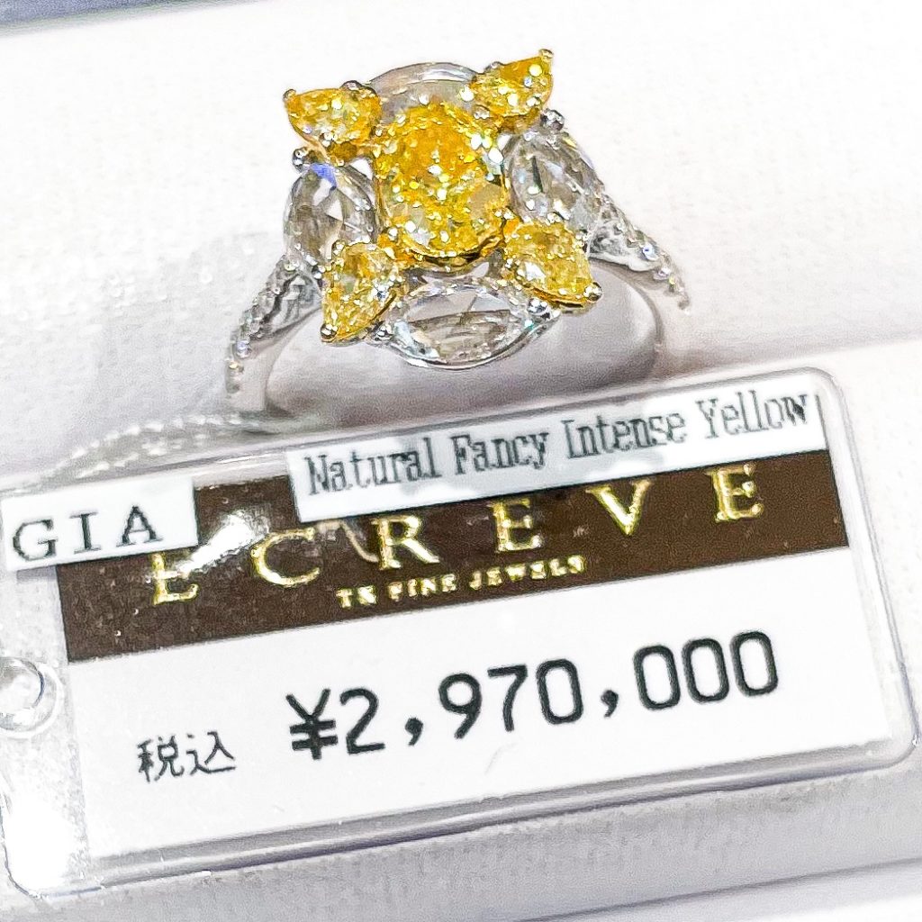 エクレブ インテンス イエローダイヤモンド 2023年4月12日 by ijima エクレブ インテンスイエローダイヤモンド インテンスイエローは、通常のファンシーイエローより濃度が濃いイエローです。 オーバルカットが中心に色を集めやすく、より濃い鮮やかなイエローに観えます。 中石 0.68ct VS1 の周りに 0.48ct のペアシェープイエローダイヤ 4隅には大粒のマーキスカットを4ピース 0.80ct 配置 GIA鑑定のインテンスイエローダイヤモンドで、お買い得な一点です。