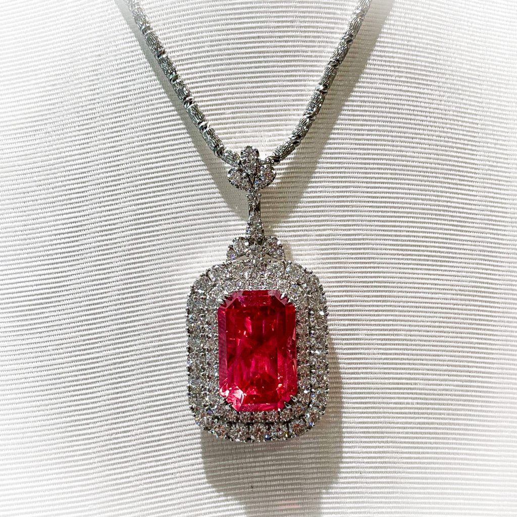 通常は、摺りガラスのような桜色の石が多いのですが、このような赤色の内包物も無く大きな石は宝石商でも逢うことができない希少な逸品です。