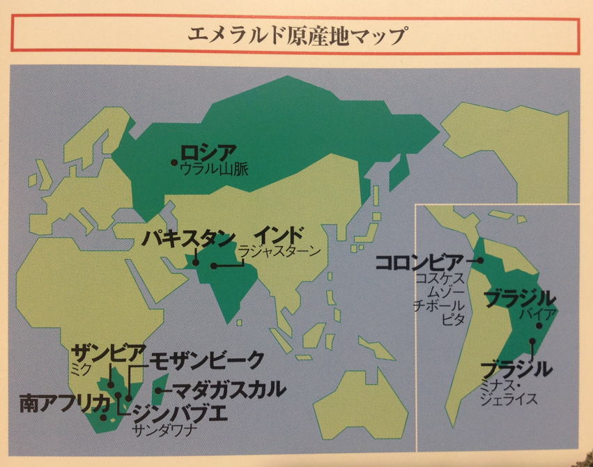 エメラルド原産地MAP 2015年10月2日 by ijima 現在のところ、エメラルド主要産出国は、コロンビアを中心にブラジルを含めた南米大陸、ザンビアジンバブエ、マダガスカル、南アフリカなどのアフリカ大陸に二極分化されている状況です。ロシアやパキスタンなどは、特に資産価値を持つエメラルドを輸出する目立った動きは見えません。 インドのラジャスターンは、現在は採掘は行われていないのですが州都であるジャイプールは優れた研磨職人が2万人近くいて世界のエメラルドの原石が集まり加工される一大エメラルド集積地となっています。