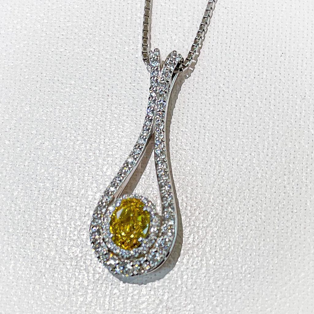 ヴィヴィッドイエローダイヤモンドペンダント 2023年7月24日 by ijima FVY SI1 1.02ct 0.80ct ヴィヴィッドイエローダイヤモンドの1.02ctオーバルカット おしゃれなデザインのペンダントで仕上がりました。 中石のヴィヴィッドイエローは、海外ブランドも使用する人気の高いダイヤモンドです。 各社で取り合いになっており、ますます高騰するばかり・・・ この作品は、まだ比較的安価で購入できた数年前に仕入れしたヴィヴィッドイエローダイヤです。 お買い得価格は 280万円