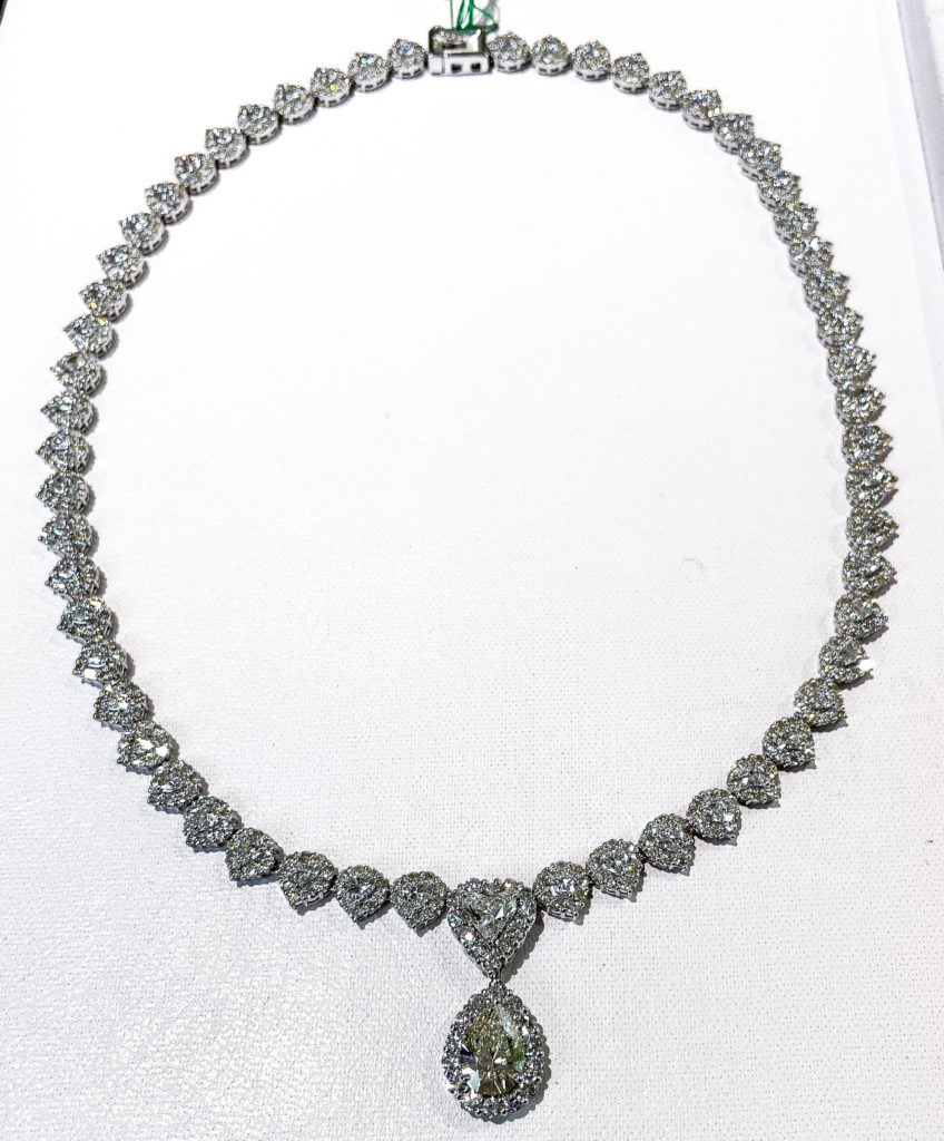 ダイヤモンドフルネック 2023年7月23日 by ijima ダイヤモンド フルネックレス 2.006ct 0.91ct 14.79ct 0.63ct Pt 豪華絢爛、ダイヤモンドフルネックレスのご紹介です。 中心のペアシェープ型のダイヤモンドは、2.006ct VS2 Mカラー 上のハート型のダイヤモンドは、0.910ct SI2 Hカラー 首周りのフルダイヤモンドは全てハート型のダイヤモンドを集めました。その合計キャラットは、14.79ct そしてそのハート型ダイヤモンドの周りにはメレダイヤをすべて取巻きしました。その総数は0.63ct 肌に添うように丁寧に製作されています。 700万円税込でご案内いたします。