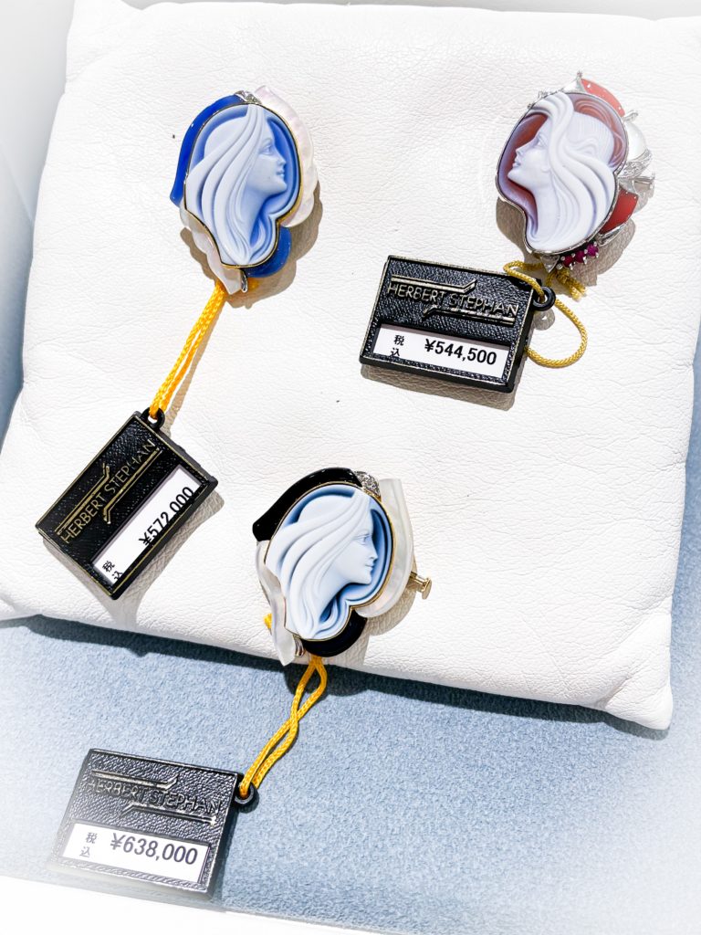 メノウカメオ エルヴィンポーリ作品 2023年8月23日 by ijima カメオの彫刻といえば、中世の高貴な女性をモチーフにしたものが多く、巻毛のイメージが強いですね。 エルヴィン・ポーリは、現代の力強い女性を彫刻しています。少し上向きで未来を見つめる現代女性をイメージした作品ですね。 形も変形し、動きのあるオシャレなブローチです。