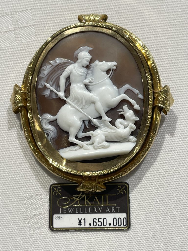 この作品も19世紀のシェルカメオで、ギリシャ神話のワンシーンを彫っている。
