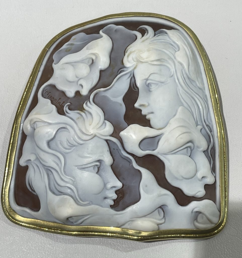 ジェンナーロ・ガロファロ 2023年9月10日 by ijima 1941年 生まれ 1952年 ナポリのトーレ・デル・グレコの芸術学校に入学 1954年 13歳でシェルカメオ第一作を完成 1957年 コンクールで巨匠たちを圧倒し優勝 作風に女性2人の連なる横顔など新しいスタイルを取り入れる。 解剖学的観点から見た奥深い綿密な彫刻研究に打ち込む。 1970年 イギリス王妃コレクションに購入される。