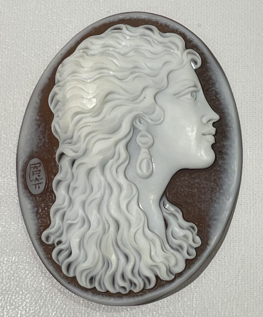 カルロ・パルラーティ② 2023年9月13日 by ijima パルラーティーのカメオ彫刻は、数量に限りがあり、作品数が圧倒的に他の作家に比べて少ないのが絶大なる人気の秘密なのかもしれません。 しかも、写真のようなカメオルース(裸の状態)は、大変希少でオークションにもかけられるほどの人気です。 娘さんが同じ『パルラーティー』の名前で作風の似たカメオを製作しております。 娘さんのサインは、横文字になっていますので、すぐにわかるようになっています。 お父さんのサインは縦に『Parlati』と刻まれています。
