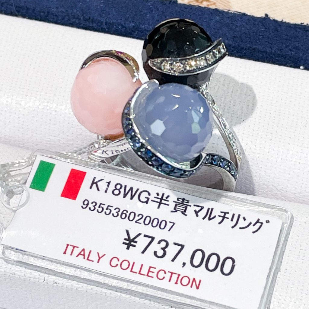 イタリー 半貴石マルチリング 2023年9月15日 by ijima 水晶やメノウなどの半貴石をカーヴィング(石の彫刻)を施し、カットボールにしています。 ボールに巻き付くように絡めた地金にもダイヤやサファイヤを埋め込んであります。
