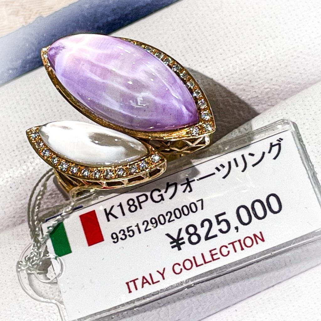 イタリー クオーツリング② 2023年9月17日 by ijima 紫水晶(アメジスト)と長石(ムーンストーン)を組み合わせた幻想的な色使い。 アメシストもムーンストンも、あえて不透明なカボション石を使用して色の変化を楽しんでいます。
