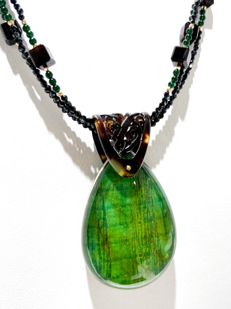 琥珀(グリーンウッドアンバー) 2023年10月21日 by ijima 鮮やかなグリーンが目を引く新しい琥珀ジュエリーです。 セイヨウ・トネリコ(聖なる木、生命樹)を2ミリ厚にスライスして緑色に顔料にて色付けし、両面に天然琥珀を貼り整形して作られています。 顔料は厚塗りせず、ウッドの美しい木目を生かしてよりナチュラル感を演出しています。