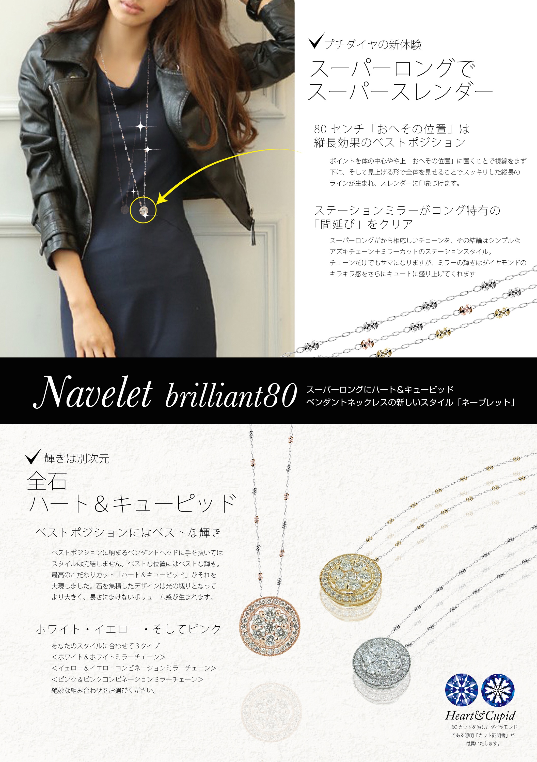 80センチのロングペンダントで、スレンダーに変身しましょう。 K18 YG・PG・WG 各 216,000円 特別価格