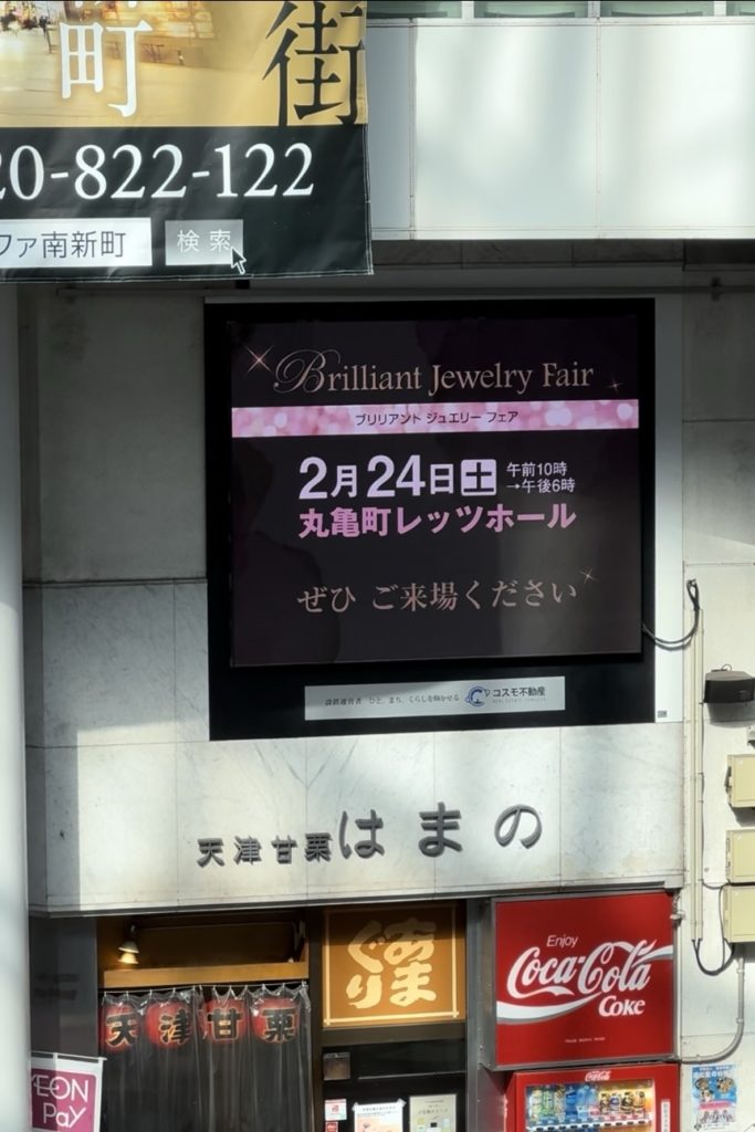 サイネージ広告塔 2024年2月2日 by ijima 丸亀町ドーム広場にある大型テレビジョンで、丸亀町レッツホール「ブリリアントジュエリーフェア」の予告を15秒の動画にしてサイネージ広告を開始しております。ぜひ、ご覧になり感想をお聞かせください。