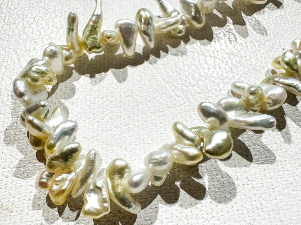 天然無核真珠 芥子(ケシ) 2024年3月27日 by ijima 日本の海で養殖されている「アコヤ貝真珠」 人工的に核を挿入して養殖をしています。 しかし、本来、アコヤ貝は異物に対して真珠層を巻く性質を持っているので、砂や食べ残しなどにも真珠層を巻いて自身で天然無核真珠を作ります。 写真はアコヤ貝から自然に採取した天然無核真珠を集めたジュエリーです。ボーン型と言い、「骨」のようですね。