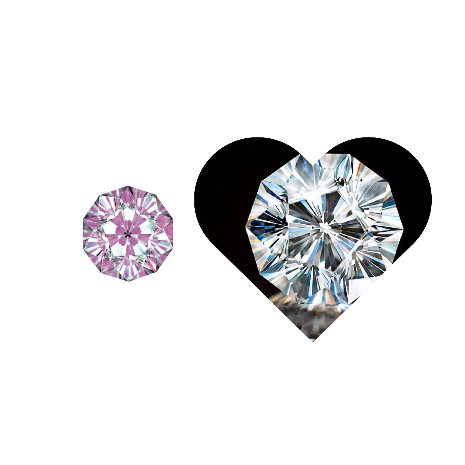 さくらダイヤモンド 2015年3月15日 by ijima これが、さくらダイヤモンドのカットの拡大写真です。87面カット。通常のブリリアントカットが58面体なので、1.5倍のカット面数ですね。花(ハナ)の87面と覚えてください。通常の丸い形に見えますが、実は10角形。また、次の機会に詳しくご説明します。とりあえず、中心に桜の花が咲いたダイヤモンドと記憶してください。当店では、エンゲージリングを中心に大好評です。
