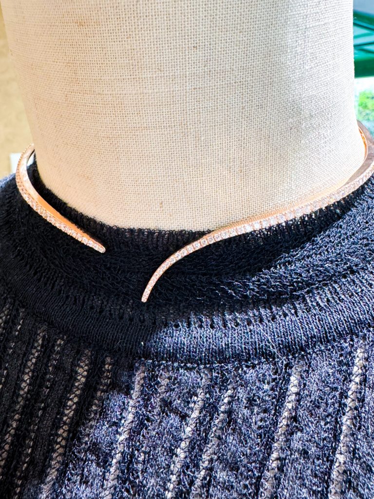 ダイヤネックレス チョーカー 2024年4月30日 by ijima チョーカーで装着するフルダイヤモンドネックレス 新作 バングルの金具を応用したバネ式で開閉する箇所を2か所首の後ろ側で作ってある。 跳ね上がるように開閉するので着脱ともにし易い。 ダイヤモンドが目立つように全て、正面向きにセッティングされています。