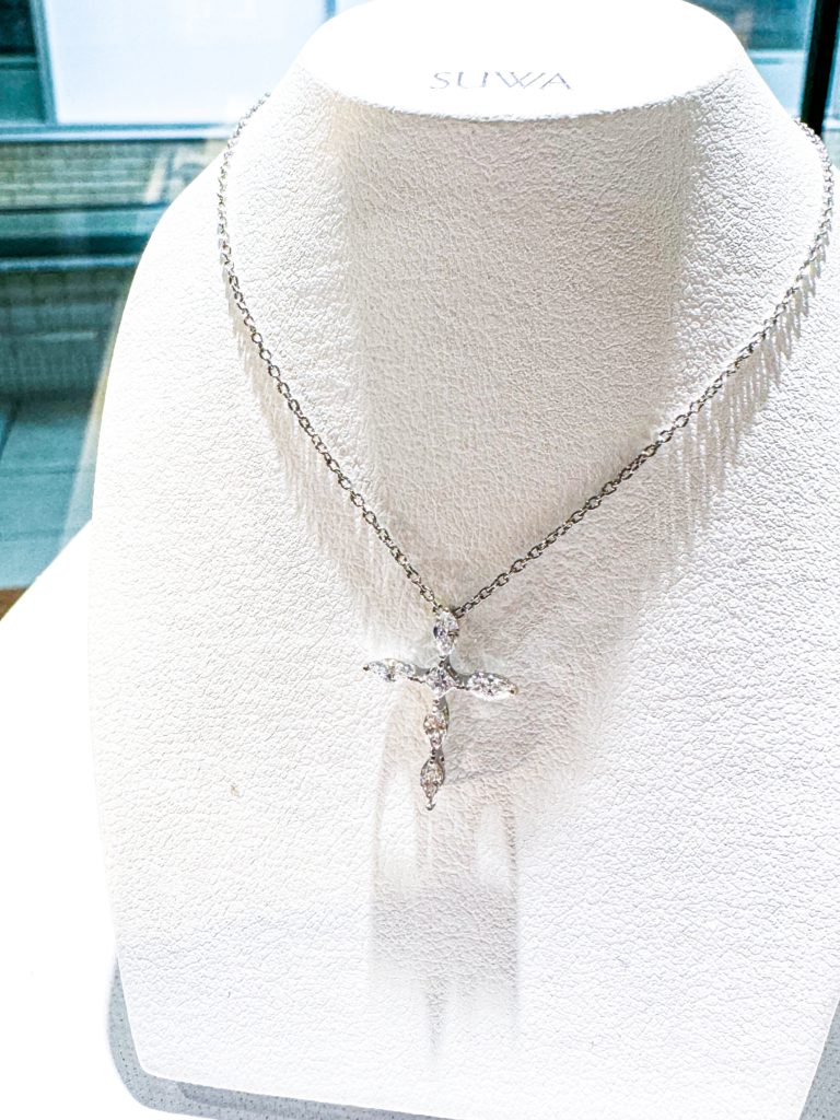 SUWA ダイヤモンドクロスペンダント 2024年5月14日 by ijima Pt950 ダイヤモンドペンダント 0.35ct マーキスカットとプリンセスカットの美しい輪郭と輝きが調和して、繊細なクロスが表現されたクラシックなペンダントです。 385,000円税込