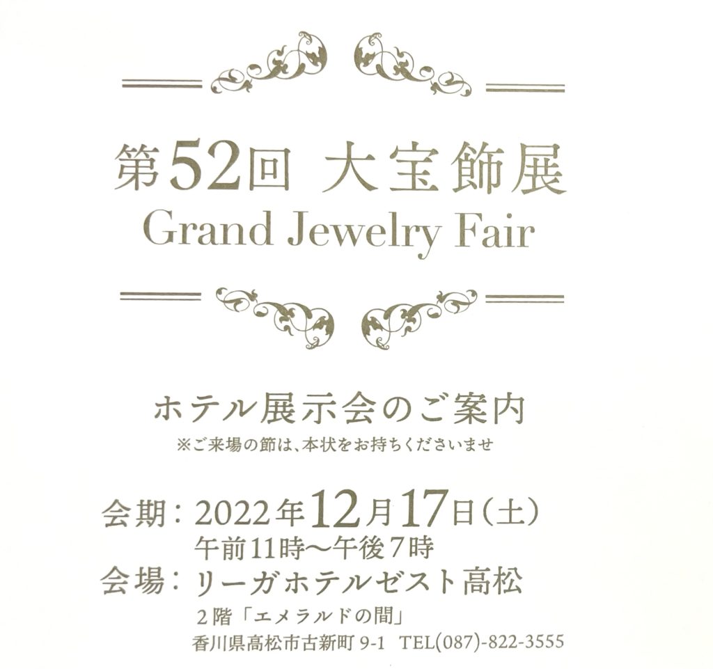明日はクリスマス展示会 2022年12月16日 by ijima 明日は、上記のとおり「リーガホテルゼスト高松」にて、第52回 大宝飾展を開催いたします。 毎年恒例の催事で、コロナ禍でも、開催し続けてまいりました。 今年は、飲食などの規制も緩やかになり、例年どおり