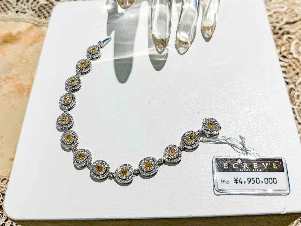 イエローダイヤブレス 2024年8月24日 by ijima イエローダイヤモンドを13ピース使用し、二重にダイヤモンドを取り巻きしたブレスレットです。 イエローダイヤモンドのリングを持たれた方は欲しくなるアイテムでしょう。 合計6ct以上使用してこの価格は、意外にお安いかも・・・ 写真をサロンの応接で撮っただけなので店頭にはありません。 欲しい方はご一報ください。