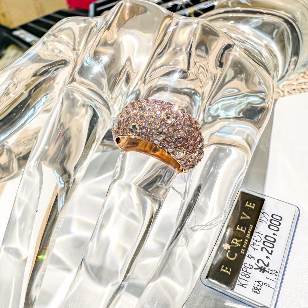 ピンクダイヤリング 2024年8月22日 by ijima ピンクゴールドの地金にピンクダイヤモンド(LP)のメレをパヴェ状に埋め込んだリング。 パヴェとは、フランス語で「石畳」。ヨーロッパの街の石畳のように規則正しくダイヤモンドを埋め尽くした石止めの名称です。 贅沢ですね。ピンクダイヤモンドが希少になった今、まさに世界クラスのファッションリングです。 写真をサロンの応接で撮っただけなので店頭にはありません。