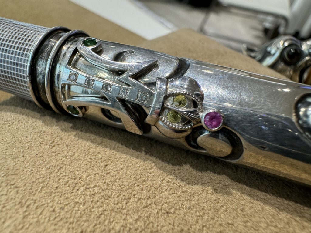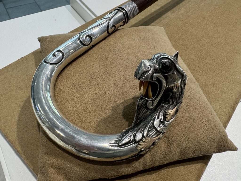 jewellery stick 紹介 2024年8月17日 by ijima シードラゴン ステッキ 歯には象牙が装飾として使われている。 100年以上前に製作されたアンティークステッキ。 シルバー製 梶光夫によるジュエリー装飾 1890年頃 ルビー、サファイア、ガーネット、ダイヤ 1,760,000円