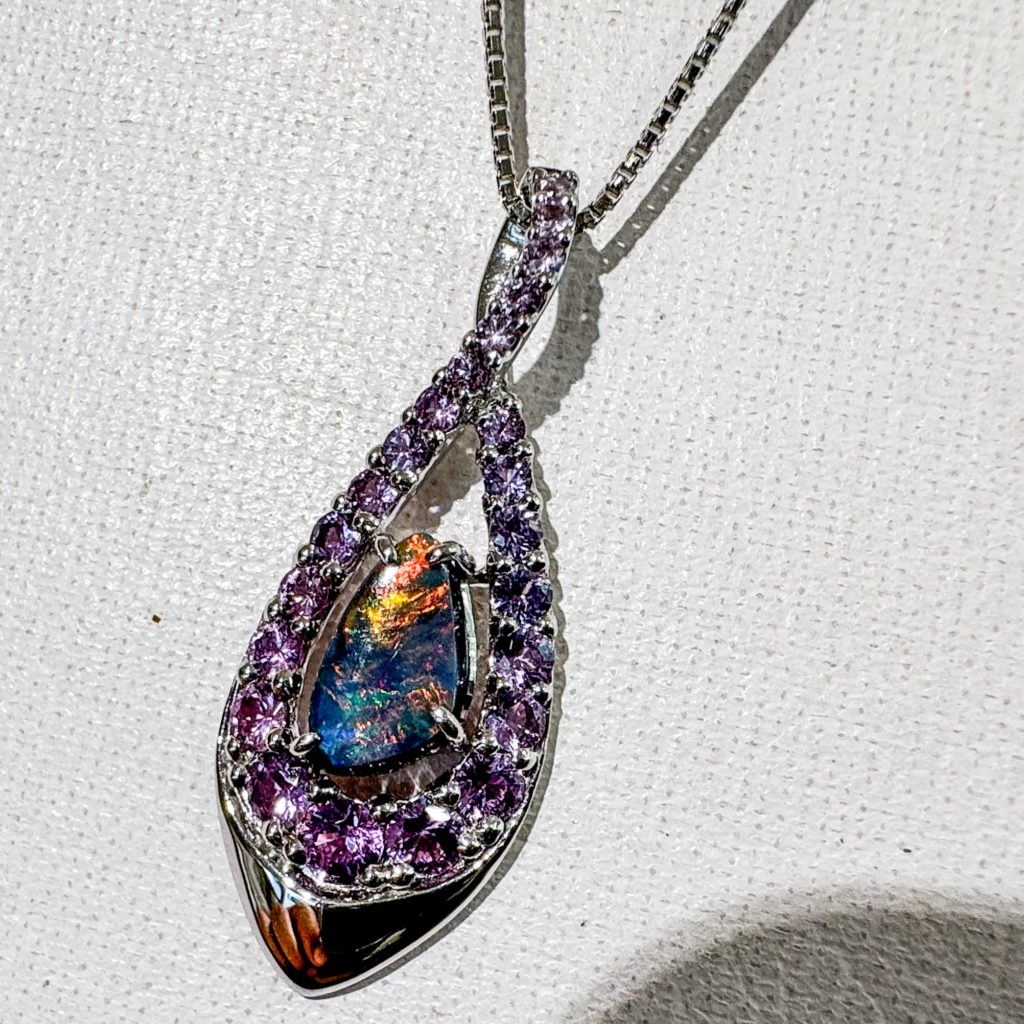 ブラックオパールペンダント 2024年10月9日 by ijima ブラックオパール 0.85ct ピンクサファイヤ 0.93ct Pt900 紹介する写真のブラックオパールの「ハーレクイン(Harlequin)」と呼ばれるブラックオパールの澄んだ強い色の大きめのパターンは絶妙です。 角度を変えると次々と美しい表情を見せてくれます。 もちろん無処理の希少なブラックオパールです。 取り巻きには、ピンクサファイヤのメレを埋め込んでいます。 ブログを見た方だけに 480,000円税込で販売致します。