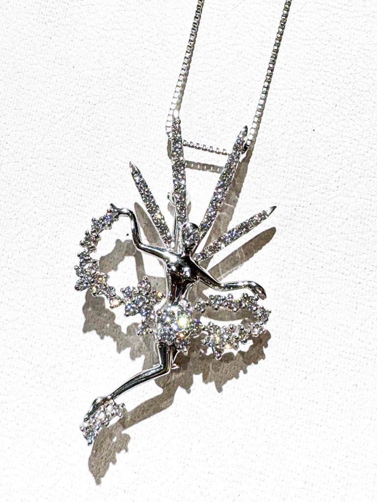 妖精 ペンダント 大 2024年11月2日 by ijima 華やかな大きめのティンカーベルをモチーフにしたダイヤモンドペンダントです。 ダイヤモンドの粉を巻きながら、宙を舞っている感じが分かりやすい大きさです。 ダイヤモンドは 1.12ct 使用しています。 Pt製作で、裏側にK14WGのブローチ金具(鉄砲式)が付いています。 ブログを見た方だけ 税込 500,000円でご奉仕いたします。 こちらも現品限り。リピート不可です。