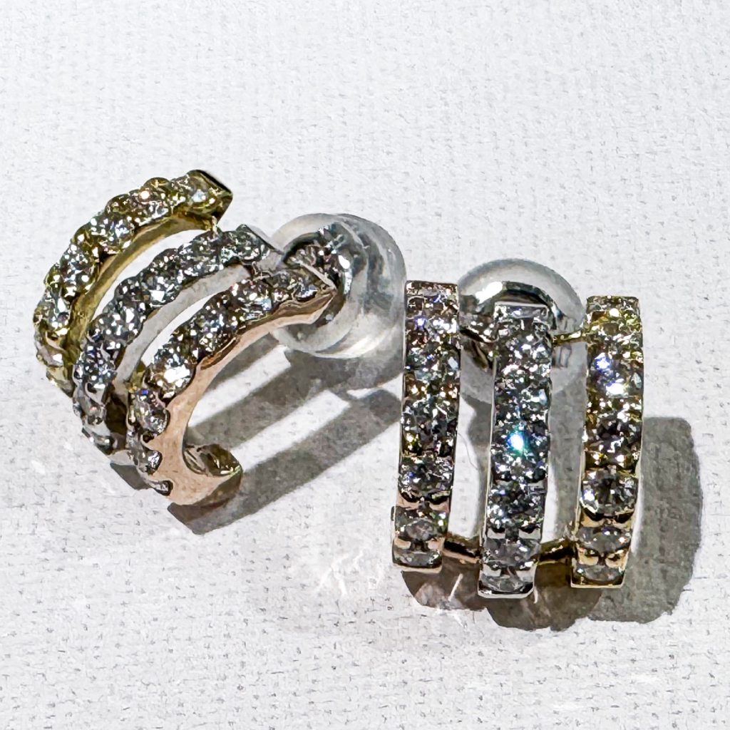 写真のピアスはK18/Pt900がコンビになっていて、スリーカラーの3連にダイヤモンドのメレを並べています。