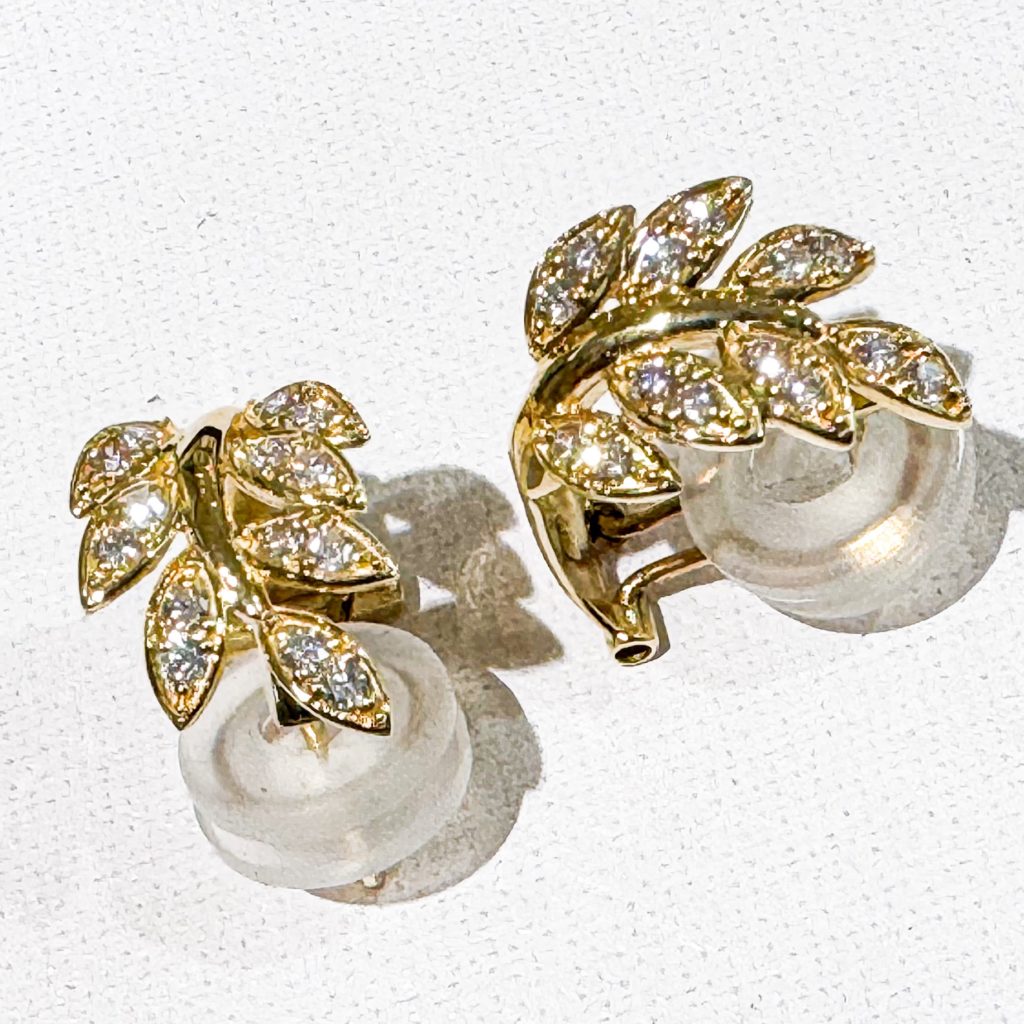 ダイヤモンドピアス 2024年11月9日 by ijima こちらのピアスは、ポストにキャッチを差し込むタイプでなく、クリップ式イヤリングと同じようにポストを差してからクリップで止めるピアスです。 このようなモチーフのデザインは耳の上で回転してデザインが変わることが無いようにしっかりと耳たぶに固定します。 K18 ダイヤモンドは片側0.16ct で、合計0.32ctメレダイヤモンドが入っています。 特別価格 165,000円税込で販売致します。