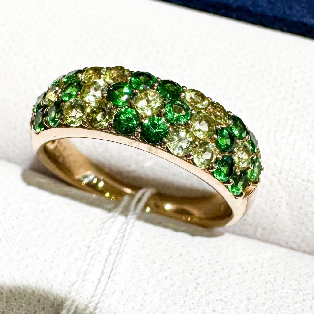 通常、このようなパヴェデザインのファッションリングにはダイヤモンドのメレを埋め込むのですが、今回は同系色のグリーンのペリドットを埋め込むことにより、ピンクゴールドの地金とグリーンの相性の良さを引き立てています。また価格も大きく抑えることが可能になりました。