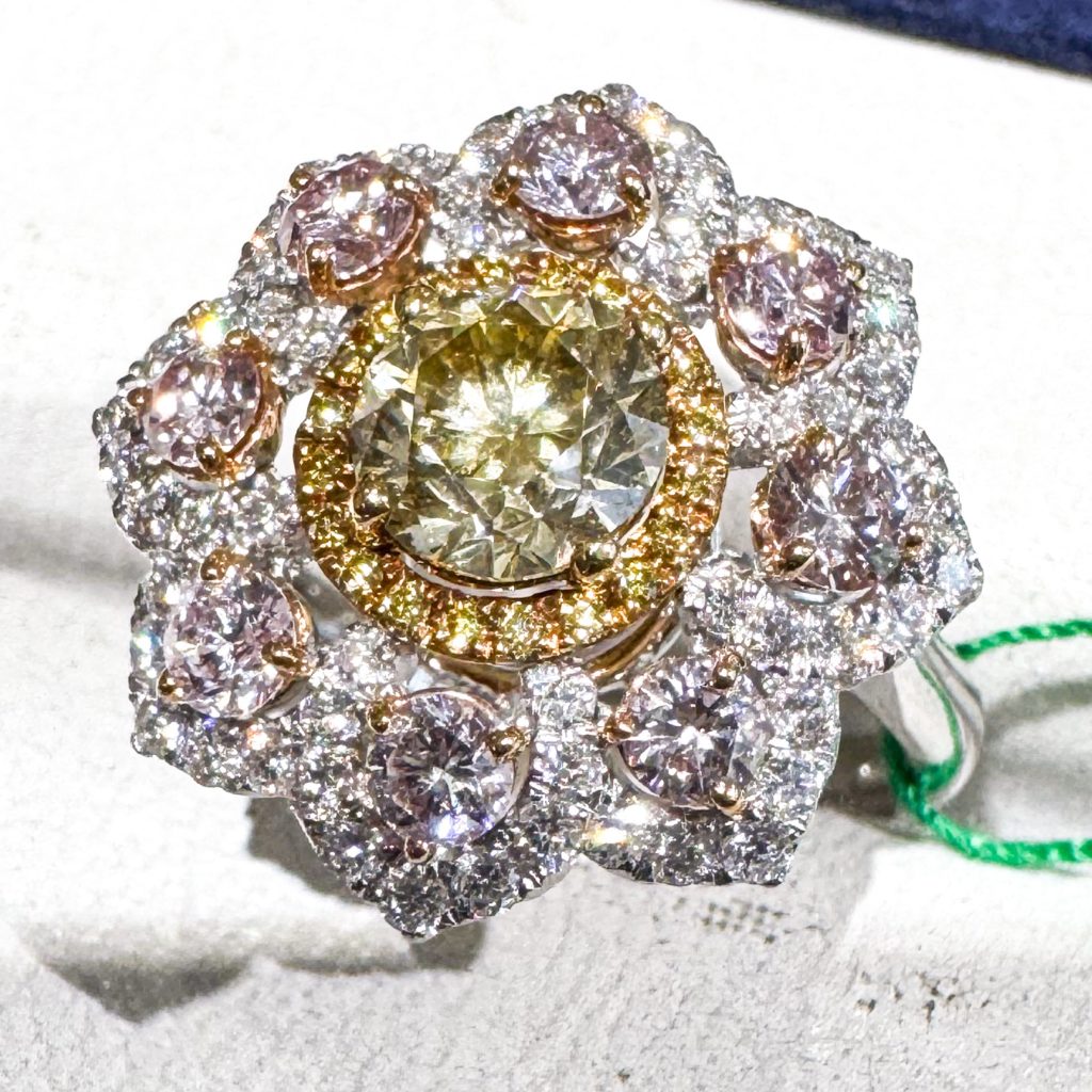 イエロー&ピンクダイヤリング 2025年1月10日 by ijima ファンシーディープイエロー SI2 0.964ct センターダイヤモンドは、ファンシーディープイエロー SI2 0.964ct イエローダイヤモンドのメレダイヤを取り巻き、更に大きく存在感をアップ。 その外側に贅沢にピンクダイヤモンドを8石巻いています。 ピンクダイヤモンド 合計0.806ct ダイヤモンドメレ 合計0.55ct イエローダイヤメレ 合計0.10ct 特別価格 250万円税込
